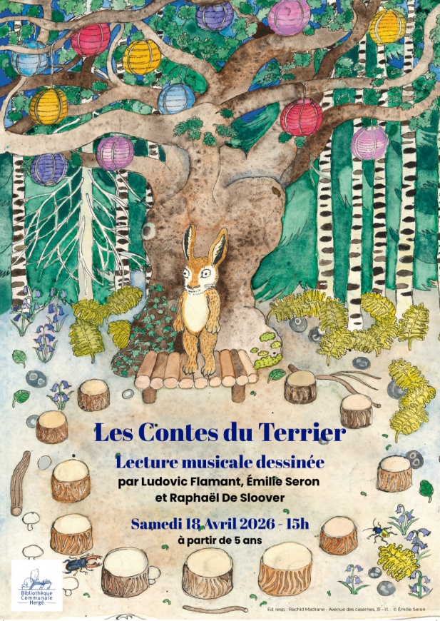 À l’occasion de la parution du livre Les Contes du terrier, la bibliothèque Hergé a le plaisir d’accueillir Ludovic Flamant, Émilie Seron et Raphael De Sloover pour une lecture musicale dessinée adaptée du livre.